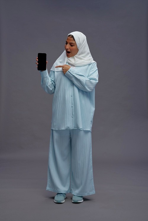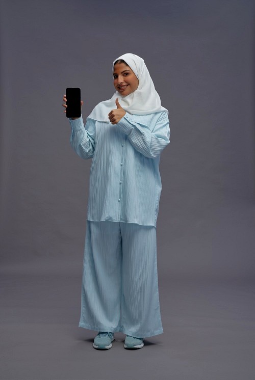 Saudi woman wearing hijab clothes standing showing phone to camera on gray background