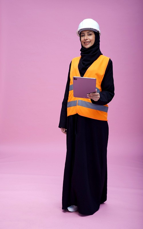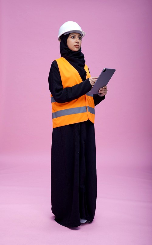 Saudi woman wearing Abaya with engineer vest and helmet standing working on tablet on pink background