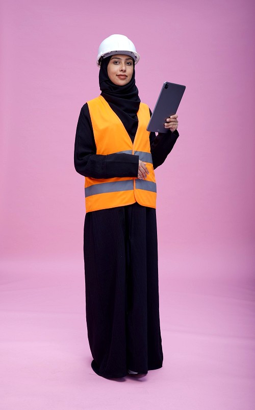 Saudi woman wearing Abaya with engineer vest and helmet standing working on tablet on pink background