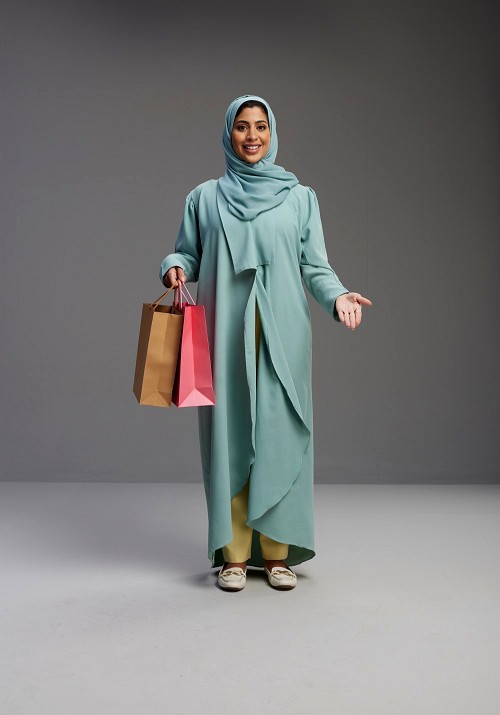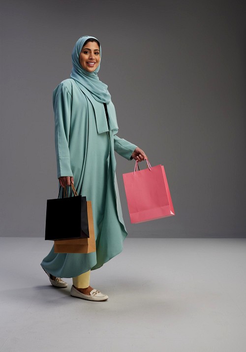 Saudi Woman wearing Abaya standing holding shopping bag on Gray background