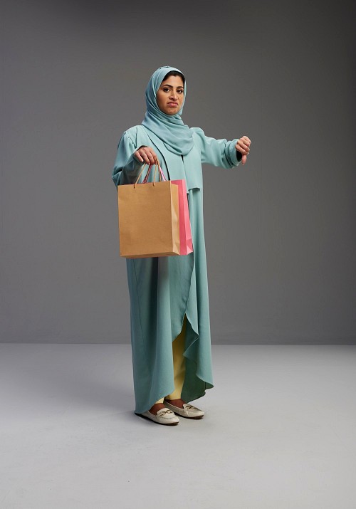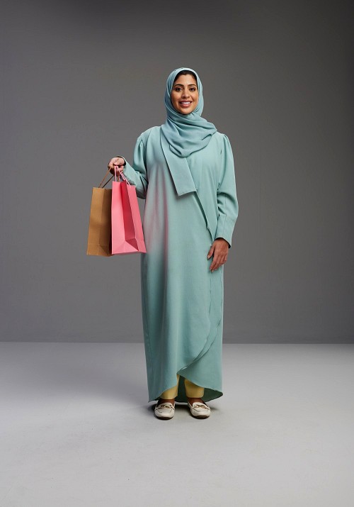 Saudi Woman wearing Abaya standing holding shopping bag on Gray background