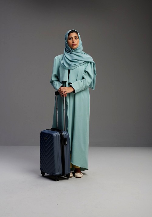Saudi Woman wearing Abaya standing holding Travel bag on Gray background