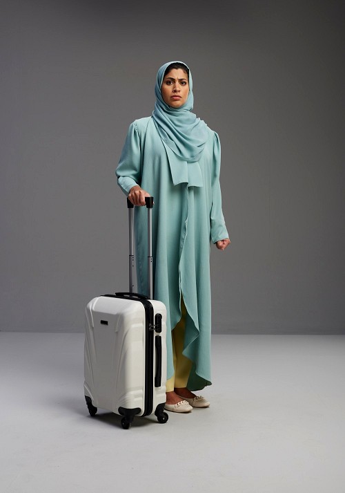 Saudi Woman wearing Abaya standing holding Travel bag on Gray background