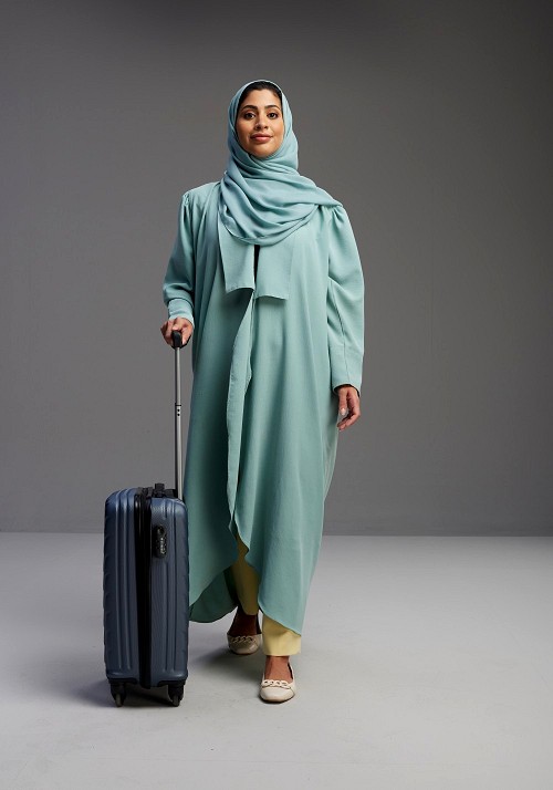 Saudi Woman wearing Abaya standing holding Travel bag on Gray background