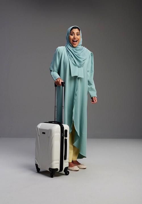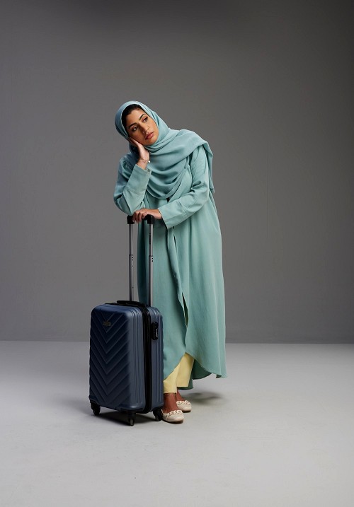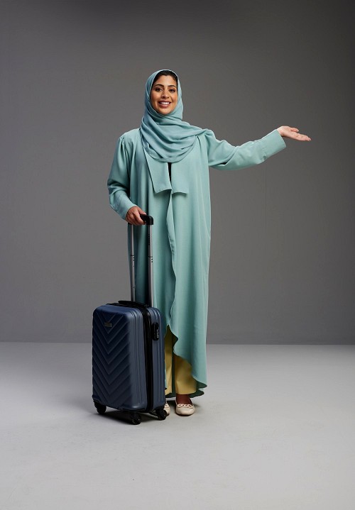 Saudi Woman wearing Abaya standing holding Travel bag on Gray background