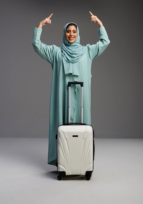 Saudi Woman wearing Abaya standing holding Travel bag on Gray background