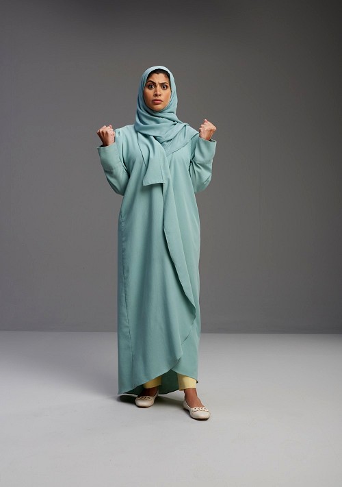 Saudi Woman wearing Abaya standing interacting with the camera on Gray background