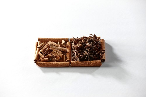 2 squares of cinnamon sticks full of star anise and cinnamon on white flooring