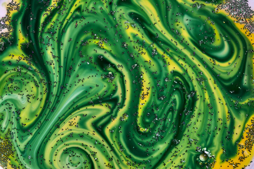 A close-up of sparkling green glitter scattered on swirling yellow and green background