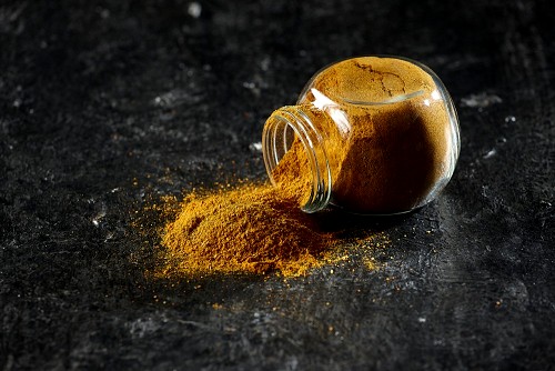 A flipped glass spice jar full of turmeric powder and powder spilled out of it on textured black flooring