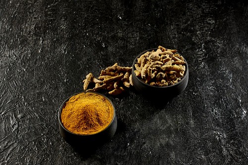 2 pottery black bowls, one full of turmeric powder and the other full of dried turmeric whole fingers on a textured black flooring