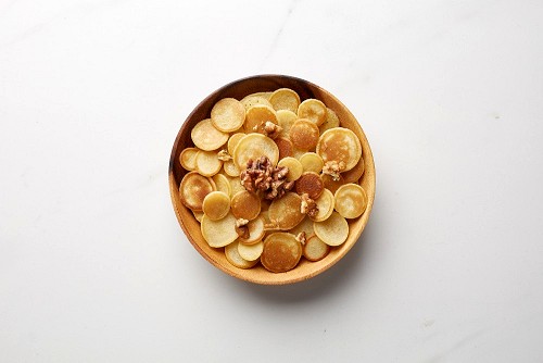 Top-view shot of walnut cereal pancakes in a round bowl on white background